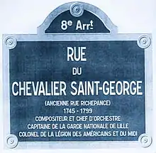 In 1753, his father took Joseph, aged seven, to France for his education, installing him in a boarding school, and returned to his lands on Guadeloupe.[15] Two years later, on August 26, 1755, listed as passengers on the ship L'Aimable Rose, Bologne de Saint-Georges and Negresse Nanon landed in Bordeaux.[16] In Paris, reunited with their son Joseph, they moved into a spacious apartment in the St. Germain neighborhood at 49 rue Saint André des Arts.[17][18]