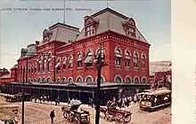 The remaining four original companies used the station when it opened in 1881. The headhouse of the Union Depot, a narrow building, fronted onto Canal Street and stretched from Madison Street to Adams Street.[25] Tracks led into the station from the south, and platforms occupied a strip of land between the back of the headhouse and the bank of the Chicago River. South of the station, Adams, Jackson, and Van Buren Streets rose over the tracks and the river on bridges. The station, along with its successor, was effectively two back-to-back stub-end terminals. Virtually all trains arriving would terminate there, and passengers traveling further would need to change trains.[7]