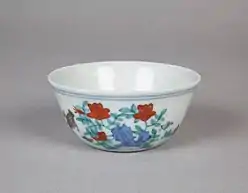A Chicken Cup (Chenghua) is a bowl-shaped vessel made of Chinese porcelain painted in the doucai technique. Chicken cups were created during the Ming dynasty (1368 – 1644), during the Chenghua Emperor's reign (1465 – 1487) in China, and originally functioned as a vessel to drink wine from. Chenghua Chicken Cups were created in an imperial kiln in the Jingdezhen porcelain factory, in Southern China.[1] The Emperor Chenghua had the Chicken Cup created in the 15th century as an act of devotion for his empress mother who was recorded to have an appreciation for small objects and valued a simple design taste.[2]