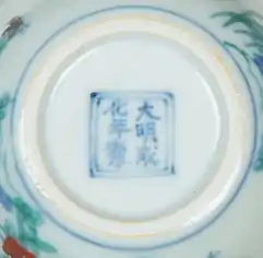 The cup's structure includes a flared mouth, sides with shallow curvature, an everted rim and a recessed, ringed base. The cup also features a lip with a very slightly grainy texture which was theorised to occur as a result of the manufacturing process.[12] Although the cups differ in size, they are recognised for their miniature structure, with the Doucai cup located at the Metropolitan Museum of art measuring approximately 4.1 cm in height, 8.3 cm in diameter and 3.7 cm diameter of base. The inside of the cup is white and does not have any painting design. The inside also features a distinctive Chenghua mark. This is a six-character mark which is decoded to inform the reader of the cup's creation during the Ming Dynasty within the Chenghua reign. This is painted in a blue and white glaze and is structured within a double-lined rectangular frame, which is also repeated through the double line border at the base and at the lip of the cup. The material of the Doucai porcelain is recorded as tactile, soft and thin.[24]