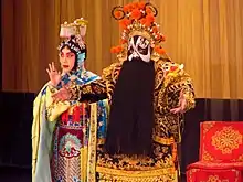 Various song and dance dramas developed during the Six Dynasties period. During the Northern Qi Dynasty, a masked dance called the Big Face (大面, which can mean "mask", alternatively daimian 代面, and it was also called The King of Lanling, 蘭陵王), was created in honour of Gao Changgong who went into battle wearing a mask.[11][12] Another was called Botou (撥頭, also 缽頭), a masked dance drama from the Western Regions that tells the story of a grieving son who sought a tiger that killed his father.[13] In The Dancing Singing Woman (踏謡娘), which relates the story of a wife battered by her drunken husband, the song and dance drama was initially performed by a man dressed as a woman.[12][14] The stories told of in these song-and-dance dramas are simple, but they are thought to be the earliest pieces of musical theatre in China, and the precursors to the more sophisticated later forms of Chinese opera.[12][15]