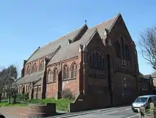 The church roof originally had vents to allow fumes from its gas lighting to escape, but these have been removed.[7] Early in the 20th century, a carved timber reredos was added inside.[12] A World War I memorial was erected next to the entrance porch soon after the war ended,[7] and the original north transept was later converted into a vestry to form a memorial to victims of World War II.[12] The church had been damaged by wartime bombing in February 1943, although it was soon repaired. The distinctive corner turret was comprehensively restored in 2003: work was carried out on its clock, bell, spire and the weathervane.[13]
