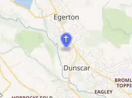 Walmsley was the old name for the present village of Egerton. The first known building there was originally a chapel of ease in the ancient parish of Bolton le Moors. The date that this original chapel was built is not known, but the Diocesan Church Calendar stated that it existed in 1500 and the first documentary evidence appears to be in the "Inventories of Church Goods 1552".[3] The chapel was rebuilt in 1771, but was demolished in 1839. Colonel JW Slater had the old site excavated in the early 1900s and found three older layers under the Georgian chapel, the lowest, he supposed to be of late Saxon origin, being an equal-legged cross in plan. The upper layers had an extended main leg. The church was originally completed in 1839 and designed by the Lancaster architect Edmund Sharpe.[4] It was the first substantial church with aisles to be designed by Sharpe.[5] Although the estimated cost was £2,150, the actual cost was £3,557 (equivalent to £320,000 in 2019),[6] towards which a grant of £300 was given by the Incorporated Church Building Society. The church provided seating for 512 people.[7] It was consecrated on 3 October 1839 by Rt Rev John Bird Sumner, then the Bishop of Chester.[8] Organ and Quire Gallery added 1843, Chancel, Organ Chamber, Vicar's Vestry and Transepts were added in 1867 to the design of Edward Paley of Sharpe and Paley, Lancaster.[4][9]