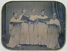 The choir's first known performance was for Christ Church's consecration in September 1845, when it was augmented by members of the Sydney Choral Society.[21] The choir was the first in New South Wales to wear surplices.[22] The choir stalls were originally on each side of the aisle in the nave. In 1885 the choir moved into the expanded chancel. Since the 1940s it has sung in the St Laurence Chapel.