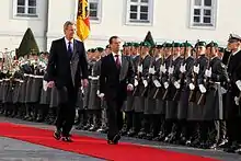 Prior to the 2005 Federal Election, Wulff had been mentioned as a potential candidate for the German chancellorship. Surprisingly, in a spring 2005 poll, 28 percent of all respondents named Wulff as their preferred candidate for the Christian Democrat nomination for Chancellor in the 2006 election.[9] As Wulff only began his first term as Minister President in early 2003, he largely dismissed such speculations.[10] Speculation had particularly increased since the December 2004 Christian Democrat federal convention in Düsseldorf, when Wulff was re-elected deputy leader of the federal party with roughly 86 per cent of all delegates supporting him. However, the premature dissolution of the Bundestag in 2005 and the subsequent election of Chancellor Angela Merkel largely put an end to further speculation about Wulff's future at the time.