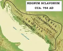 The region of Bosnia is described to span the area west of the river Drina, "up to the Pine mountain" (Latin: ad montem Pini, Croatian: do gore Borave).[19] The location of this Pine mountain is unknown. In 1881, Croatian historian Franjo Rački wrote that this refers to the mountain of "Borova glava" near the Livno field.[20] Croatian historian Luka Jelić wrote the mountain was located either between Maglaj and Skender Vakuf, northwest of Žepče, or it was the mountain Borovina located between Vranica and Radovna, according to Ferdo Šišić's 1908 work.[21] In 1935, Serbian historian Vladimir Ćorović wrote that the toponym refers to the mountain of Borova glava, because of etymology and because it is located on the watershed (drainage divide).[22][23] In 1936, Slovene ethnologist Niko Županič had also interpreted that to mean that the western border of Bosnia was at some drainage divide mountains, but placed it to the southeast of Dinara.[24] Croatian historian Anto Babić, based on the work of Dominik Mandić in 1978, inferred that the term refers roughly to a place of the drainage divide between the Sava and Adriatic Sea watersheds.[25][26] In her discussion of Ćorović, Serbian historian Jelena Mrgić-Radojčić also points to the existence of a mountain of "Borja" in today's northern Bosnia with the same etymology.[22]
