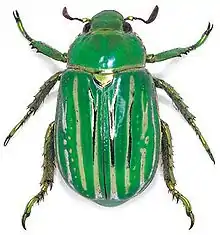 Chrysina gloriosa is a species of scarab whose common names are glorious beetle and glorious scarab. The adults are 25 to 28 millimetres (0.98 to 1.10 in) long and are bright green with silver stripes on the elytra. These iridescent stripes on the cuticle of the elytra are a result of cholesteric liquid crystal organization of chitin molecules.[1] The differences in color are a result of the microscopic structure of each section, with green reflected from cusp-like structures and silver reflected from flat layers parallel to the surface of the elytra.[2] As established through Mueller matrix spectroscopic ellipsometry,[3][4] the optical properties change with the incidence angle of the propagating light. The polygonal cells in the green stripes generate self-healing Bessel beams.[5] The adults eat juniper leaves at a high elevation and are able to camouflage by blending in with plants. The species is sometimes incorrectly thought to be endangered,[6] but has never been listed either in the IUCN Red List of Threatened Species or under the United States Endangered Species Act. An invalid synonym used to be Plusiotis gloriosa.[7]
