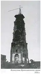 In 1933, the church was closed and gradually destroyed. Its bell tower was used for parachute training for several years. The church building was almost totally destroyed in 1940, but in 1942 divine services continued to be held in the cellar. In 1959 they were prohibited at all and all the remaining church property was expropriated. At the building of the former parish school a cinema theatre was opened.[1][2]