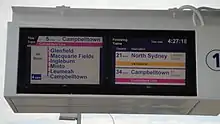 Due to the many differing types of stations that CityRail serves, their screens varied in form. In station where trains arrived at a higher frequency, 2 or more vertical LED screens were used on each platform to display the destination and arrival time whereas in low frequency areas 1 or 2 dual horizontal LED screens with a larger font were used. Manual destination indicator boards were still used at some lower patronage stations. In regional areas, a station relied on digital voice announcement for information on services. CBSM (Custom Built Sheet Metal) was responsible for the manufacture of many indicator board encasings.[28]