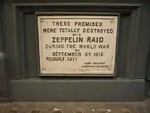 On the night of 8 September 1915, Zeppelin L13 commanded by Kapitänleutnant Heinrich Mathy attacked London, and two of his bombs hit Messrs Frank Stadelman's warehouse at 59–61 Farringdon Road. Falling masonry from the building did considerable damage to the 6th Londons' drill hall behind.[73][74]