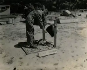 During the summer of 1945, several paper and plaster models of hilly terrain were provided, also small models of buildings, sanitary facilities, water tanks, etc. Training groups were then given the opportunity to set up a model civilian camp. Each of these camp layouts was photographed, as the basis for a team contest to see which group could set up the best camp. Considerable interest was aroused by this realistic approach to a practical problem.