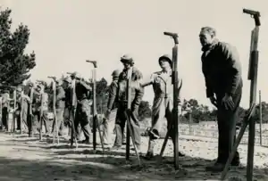 A full size civilian camp for displaced persons, occupying approximately ten acres was staked out and outlined in white tape on the Presidio of Monterrey. The camp layout was based on a recommended plan submitted to the Headquarters from the Theater.....Barbed wire fences, sanitary facilities and typical sections of barracks and other buildings were constructed in the area - with detachments participating in the construction. It was anticipated that the camp would make field problems relating to camps take on a more realistic aspect in addition to the training aid, which the actual layout would provide.[19]