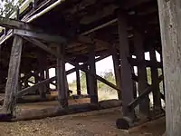 Clackline Bridge is a timber bridge spanning the Clackline Brook and the former Eastern Railway alignment, in the Shire of Northam, 77 kilometres (48 mi) east of Perth. Constrained by the topography of the site, the route of the Eastern Railway tracks, and the previous alignment of Great Eastern Highway, the bridge has a unique curved and sloping design. It has 18 spans over a 126-metre (413 ft) length, with a 1 in 20 slope and a horizontal curve radius of 400 metres (1,300 ft). There are 18 numbered piers, starting from pier 1 at the eastern end.[1]:8 The double tracks of the Eastern Railway, which linked Perth and Northam until its removal in 1981,[1]:7 passed between piers 16 and 17. Piers 14 to 17 are parallel to that former railway, at an angle of approximately 40 degrees to the bridge. This resulted in spans of various lengths: 7.6 metres (25 ft) heading out from the western abutment, then a 14-metre (46 ft) span between piers 16 and 17, followed by a 4.8-metre (16 ft) length, two 5.2-metre-long (17 ft) spans, and 13 spans of 6 metres (20 ft).[1]:8