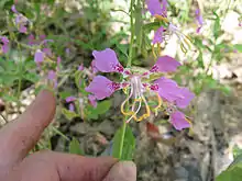 Clarkia mildrediae is an uncommon species of flowering plant in the evening primrose family known by the common name Mildred's clarkia. It is endemic to California, where it is known from the forests of the southernmost Cascade Range and northern Sierra Nevada. It is an erect annual herb often exceeding half a meter in height. The oval leaves grow up to 6 centimeters long and are borne on petioles of up to 4 centimeters. The inflorescence bears opening flowers and hanging, pointed flower buds. As the bud opens the sepals all separate instead of remaining fused as those of many other Clarkia species do. The triangular to semicircular petals are about 2 centimeters long and lavender to bright reddish-purple, sometimes with dark speckling. There are 8 stamens with anthers all alike, and a protruding stigma.