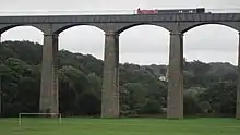 The Pontcysyllte Aqueduct was built by Thomas Telford in 1805 and is the largest aqueduct in the United Kingdom; it carries the Llangollen Canal over the River Dee and is a World Heritage Site, being considered a masterpiece of civil engineering.[35] The Clwydian Range and Dee Valley constitute an Area of Outstanding Natural Beauty, one of just five in the whole of Wales.[36] Denbigh, Colwyn and Ruthin are historic towns and Llangollen hosts the Llangollen International Musical Eisteddfod in July each year.[37]