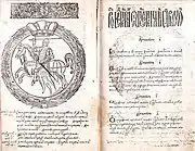 The first page of the Latin copy of Laurentius (1531) of the First Statute of Lithuania. Vytis is drawn on a damasked shield.