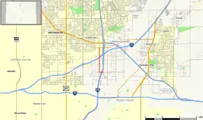 SH 53 begins at the 58th Avenue interchange (exit 215) on I-25. After a short distance west on 58th Avenue, the route turns north on Broadway Street, crossing under Interstate 76 with no access and ending at 70th Avenue (SH 224).[2][1]