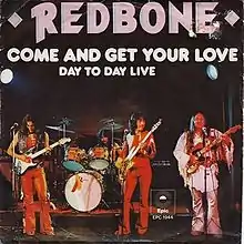 "Come and Get Your Love" is a song by rock band Redbone.[1] The song was originally released as a promo track under the name "Hail" and was later featured on the album Wovoka (1973), under its current name. The song was released as the album's first single the following year. Written and produced by band members Pat and Lolly Vegas, it is one of the band's most successful singles. It made them the first Native American band to reach the top five on the Billboard Hot 100, reaching number 5.[2] The song later appeared on many "greatest hits" albums released by the band, as well as on numerous compilation albums of the 1970s. A music video was released in 2020.[3]