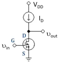 In electronics, a common-source amplifier is one of three basic single-stage field-effect transistor (FET) amplifier topologies, typically used as a voltage or transconductance amplifier. The easiest way to tell if a FET is common source, common drain, or common gate is to examine where the signal enters and leaves. The remaining terminal is what is known as "common". In this example, the signal enters the gate, and exits the drain. The only terminal remaining is the source. This is a common-source FET circuit. The analogous bipolar junction transistor circuit may be viewed as a transconductance amplifier or as a voltage amplifier. (See classification of amplifiers). As a transconductance amplifier, the input voltage is seen as modulating the current going to the load. As a voltage amplifier, input voltage modulates the current flowing through the FET, changing the voltage across the output resistance according to Ohm's law. However, the FET device's output resistance typically is not high enough for a reasonable transconductance amplifier (ideally infinite), nor low enough for a decent voltage amplifier (ideally zero). Another major drawback is the amplifier's limited high-frequency response. Therefore, in practice the output often is routed through either a voltage follower (common-drain or CD stage), or a current follower (common-gate or CG stage), to obtain more favorable output and frequency characteristics. The CS–CG combination is called a cascode amplifier.