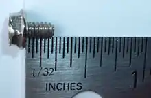 The #6-32 UNC is a UTS screw specifying a major thread diameter of #6 which is defined as 0.1380 inches (3.51 mm); and 32 tpi (threads per inch) which equates to a thread pitch of 0.031250 inches (0.7938 mm). The optional UNC specification indicates the standard coarse thread is used which is defined for #6 screws as 32 tpi rendering 'UNC' redundant, however it may be seen when other specifications such as plating or other treatments are also specified. It is by far the most common screw found inside computer cases.[1] It commonly appears in lengths of 3/16 in (0.1875 inches (4.76 mm)) and 1/4 in (0.25 inches (6.4 mm)) or less often 5/16 in (0.3125 inches (7.94 mm)). Non-standard metricized lengths such as 5 millimetres (0.20 in) are also sometimes encountered. Nearly every brand new computer case comes with a bag of these. They are commonly used for the following purposes, however there are many exceptions:
