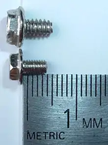 The M3 is a metric screw specifying a nominal diameter of 3 millimetres (0.12 in); and standard coarse thread pitch defined as 0.5 millimetres (0.020 in). The M3 is the second most common screw found in PCs.[1] It commonly appears in many lengths from 1 to 20 mm. Nearly every brand-new computer case comes with a bag of these. Notwithstanding many exceptions, they are commonly used for securing the following devices:[2]