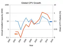 Systems using high-concentration photovoltaics (HCPV) possess the highest efficiency of all existing PV technologies, achieving near 40% for production modules and 30% for systems.[3]:5 They enable a smaller photovoltaic array that has the potential to reduce land use, waste heat and material, and balance of system costs. The rate of annual CPV installations peaked in 2012 and has fallen to near zero since 2018 with the faster price drop in crystalline silicon photovoltaics.[4]:24 In 2016, cumulative CPV installations reached 350 megawatts (MW), less than 0.2% of the global installed capacity of 230,000 MW that year.[2]:10[3]:5[5][6]:21