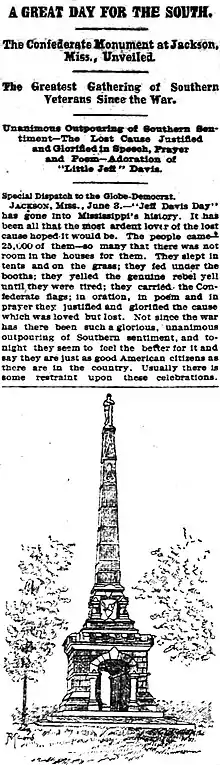 The Confederate Monument is a historic monument in Jackson, Mississippi. It features a soldier standing on top of an obelisk.[2] It was built in 1891, and its dedication was attended by many veterans of the Confederate States Army.[3] It has been listed on the National Register of Historic Places as a contributing property to the Old Capitol since November 25, 1969.[3]