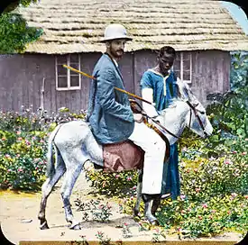 ![]() Congo-Balolo Missionary on donkey, with Congolese man (c. 1910). | |