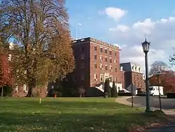 Woodward Hall, erected around 1886, is in the Queen Anne style.[2] It has an irregular profile that is accentuated by many ells. The structure exhibits multiple roofs capped by numerous chimneys, wide turrets, and large, gabled dormers. The interior has been recently remodeled. The Queen Anne style section of Woodward Hall was torn down in 2007, and there are tentative plans to develop a garden where it once stood. The "newer" section of Woodward Hall (built in the early 20th century at the same time Weeks Hall was built) still stands and houses the geriatric wards.
