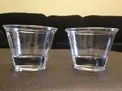 Start with two glasses of liquid that are exactly the same shape and contain the same amount of liquid. Ask the child if they are the same, or if one has more or less liquid in it. If the child replies that they are the same, the liquid from one of the short glasses is then poured into a taller, skinnier glass. A child who cannot conserve will assume the taller glass has more liquid than the shorter glass. Piaget’s other famous task to test for the conservation of liquid involves showing a child two beakers, A1 and A2, which are identical and which, the child agrees, contain the same amount of colored liquid. Then liquid from Beaker A1 is poured into a taller, thinner glass (B1) and the liquid in A2 is poured into a glass (B2) identical to B1. The child is then asked whether there is still the same amount of liquid in each of the new glasses (B1 and B2) as was in Beakers A1 and A2. A child who cannot conserve would answer "no, there is more in the tall thin glasses," while a child who can conserve would answer "yes, there is still the same amount." Piaget also replicated this task with beads in glasses, and found again that some children were able to conserve while others were not.[1][3]
