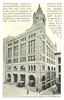 The New-York Mining and National Petroleum Exchange merged with the New-York Petroleum Exchange and Stock Board on February 28, 1885. The new institution was named the Consolidated Stock and Petroleum Exchange,[7] also referred to as the Consolidated Stock and Petroleum Exchange of New York.[3] The institution would later be renamed the Consolidated Stock Exchange of New York.[3] By its official formation in 1885, its memberships of 2403 was considered the largest membership of any exchange in the United States, excluding the New York Produce Exchange.[3] 400 of those members were also members of the New York Stock Exchange (NYSE).[8] From its inception, Consolidated employed then cutting edge clearing house techniques which were efficient at preventing frauds and the reneging on bargains.[9] Consolidated's initial business included mining stocks and petroleum pipe-line certificates, and in 1885 the sales of mining stocks amounted to 2,057,319 shares. In 1885, there was also a demand by the exchange's members for the creation of a department to deal in railroad stocks.[3] After attempts to negotiate trade areas with the NYSE, Consolidated made the decision to "accept any trade that could be obtained."[3] By March 20, 1886, the membership of the Consolidated Stock and Petroleum Exchange of New York was 2,403, where it remained limited.[7] In 1886, 6,509,481 mining stocks were sold in the Consolidated exchange, and the following year, 10,659,711. Also in 1887, trading in pipe-line certificates cam to 1,254,708,000.[3] On September 8, 1887 the corner stone of the building was put in place on the corner of Broadway and Exchange Place in Manhattan.[3]