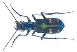 The species is distinct in its large size with iridescent blue and purple body with four white spots. There are hairs below the head (genal region) and the lateral pronotal margins are smooth and unhaired. There is considerable geographic variation and the nominate subspecies is from Southeast Asia. Specimens from India may be assigned to C. duponti barmanica but there may be more than one subspecies in India. They are found mainly along forests and near water.[1] There are several subspecies that are recognized. The species was named after Henry Dupont, a trader in specimens from whom the French entomologist Pierre François Marie Auguste Dejean had obtained a specimen noted as being collected from "Cochinchina" (Vietnam) in 1826.[2]