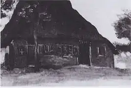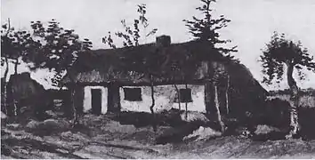 The Cottage (F83) was a home that the De Groot family, immortalized in The Potato Eaters shared with another family. The cottage has double front doors, a split chimney and quarters for two families. Seen in the evening light, the cottage seems peaceful. Van Gogh called the peasant homes "human nests".[7]