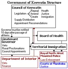 The Council of Keewatin was an unelected legislative body and territorial government for the now-defunct District of Keewatin in Canada. The District of Keewatin was created by the passage of the Keewatin Act on October 7, 1876[1] from a portion of Canada's North West Territories.[A] Lieutenant Governor Alexander Morris convinced the government that the new territorial government of the North West Territories would be unable to effectively administer land to the north and east of Manitoba.[2] Shortly after the District of Keewatin was formed a large group of Icelanders arrived, infected with smallpox which quickly spread to the indigenous First Nation population. The Government of Canada allowed the Council to be formed for the purpose of containing the smallpox epidemic. The Council also administered Indian treaty claims, immigrant land claims, Hudson's Bay Company trading post concerns as well as policing and health care. The Council lasted from November 25, 1876, until April 16, 1877, after which control of the territory was returned under federal jurisdiction.