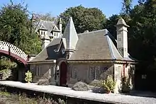 Originally known as "Cromford Bridge", it was opened by the Manchester, Buxton, Matlock and Midlands Junction Railway in 1849.[3] This is one of the few stations on the line that has been preserved and is a Grade 2 listed building. It is said to have been designed by G.H.Stokes, son-in-law of Joseph Paxton. It is believed that Stokes also designed Station House (built in 1855), the extremely ornate former Station Master's residence opposite the station on the side of the hill as well as the ornate villa style waiting room, on what was the 'up' platform. According to English Heritage,[4] this is the original station building. The present station building on the opposite (down) platform was added by the Midland Railway at a later date