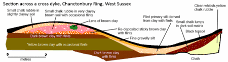 On the South Downs of southern England most cross dykes are thought to date to the late Bronze Age (c. 1000 – 700 BC) or early Iron Age (c. 700 – 400 BC) but an excavated cross dyke at Chanctonbury Ring in West Sussex has been proven to be of Roman date (AD 43 – 410). This is the only known cross dyke with such a late date.[12] Cross dykes have tended to be dated by their association with other monuments nearby, such as stone circles and Iron Age field systems, although such dating is not secure. Some cross dykes may have continued in use into the Middle Ages (AD 410 – 1485), with a few possibly being built at this late date. Some cross dykes additionally have functioned as boundaries right through to modern times, and they sometimes exhibit a close relationship with parish boundaries.[13] At the Devil's Dyke in Sussex, an Iron Age hill fort adopted an earlier cross dyke as a portion of its rampart and completely encloses a second cross dyke.[4] Excavations of several cross dykes north of Bokerley Dyke in Dorset have revealed that the dykes date to the Late Iron Age; the excavator interpreted them as settlement boundaries.[14]