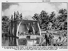 The sloping topography of the area lent itself to large gatherings, from the 1880s it was used for regular controlled balloon ascents in front of enormous crowds.[3] In 1884 a ‘Venetian Fete’ was inaugurated, illuminating the English Garden Landscape to spectacular effect with a display of 15,000 oil lamps dotted around the grounds and 2,000 coloured Chinese Lanterns suspended from the trees. The small lake was decorated with a series of semi-circles, floating on the surface and gradually diminishing in size, their reflections in the water giving the appearance of rings of light stretching into the distance. The Venetian Fete illuminations were choreographed by the pyrotechnic specialists Brocks, well known for their firework displays at the Palace.