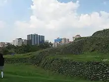 ![]() Western side of the circular pyramid at Cuicuilco. | |