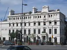 Between 1861 and 1866, before Sumners became a partner, his drawings and plans were signed by Culshaw. Sumners introduced more original and eclectic features into his designs, including Renaissance features.[24] The practice continued to design office blocks, houses, churches and institutional buildings. Notable houses included 19 Abercromby Square, Liverpool (1862).[25][26] and Quarry Bank House, Allerton (1866),[27][28] and among the churches were St Stephen, Byrom Street (1867–68, since demolished),[29] and Christ Church, Linnet Lane (1867).[30][31][32] The architectural historian Nikolaus Pevsner, writing in 1969, was particularly impressed by Sumners' design for a mortuary chapel in Everton (built in 1866, demolished after 1969).[33][34] Sumners continued the practice's tradition of building workhouses with a complex of buildings at Walton, of which the main block of 23 bays with its clock tower, has survived.[35][36][37] The practice also designed Liverpool's Royal Southern Hospital (1867, since demolished).[23]