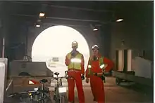 During one Sunday in October 1993, Wally Michalski and Mike Turner, working as contractors on the British side, used a pair of the Saracen bicycles to cycle the 100-kilometre round-trip from Folkestone to Coquelles and back again. The pair took around five hours to complete the journey, while wearing full overalls and needing to carry respirators.[3][4]