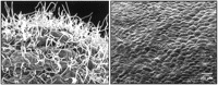 A study done testing stool specimens of raspberry farm workers showed a higher incidence of Cyclospora oocysts in their specimens compared to other people in the area.[17] This could be because Cyclospora spp. are highly resistant to disinfectants commonly used by workers for hygiene purposes and food and water processing. This resistance is probably heightened by higher binding affinities to certain fresh produce. Fine, hair-like projections on raspberries help facilitate the entrapment of the sticky oocysts to their surfaces compared to those of other fruits, such as blackberries. Contrast between the surface of a raspberry (left) and a blackberry (right), as viewed by scanning electron microscopy: Note the uneven surface of the raspberry, complete with crevices and hairs.[18]