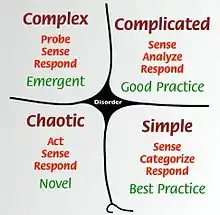 Cynefin offers five decision-making contexts or "domains": simple, complicated, complex, chaotic, and a centre of disorder.[lower-alpha 4] The domain names have changed over the years. Kurtz and Snowden (2003) called them known, knowable, complex, and chaotic.[4] Snowden and Boone (2007) changed known and knowable to simple and complicated.[lower-alpha 1] Since 2014 Snowden has used obvious in place of simple, and is now using the term clear[6]