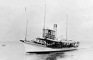 Starting in the summer of 1900, Anderson ran the vessel as a passenger ferry between Madison Park and Leschi Park.[21] In 1903, Anderson acquired Xanthus, another of James Coleman's yachts. He paired her with Cyrene to create a passenger ferry service that ran every half hour between Leschi Park, Madrona Park, and Madison Park.[22] The fare was 10 cents.[23] Business was good. Too good on occasion. In 1907 Cyrene was fined $393.50 for taking 30 more passengers than the law allowed.[24] In 1914 Cyrene ran from Leschi Park to various points on the west side of Mercer Island eleven times daily.[25]