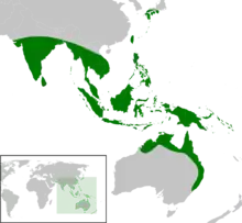 Double-tailed tent spiders are widespread in tropical Asia and Australia. Their native range extends from Australia to southern Japan and from the Philippines and Papua New Guinea to as far west as India.[13] They usually build their permanent webs on the branches of trees or shrubs.[3][8]