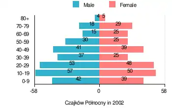 According to the 2002 Poland census, there were 582 people residing in Czajków Północny village, of whom 51% were male and 49% were female. In the village, the population was spread out, with 28% under the age of 18, 38% from 18 to 44, 18.9% from 45 to 64, and 15.1% who were 65 years of age or older.[1]