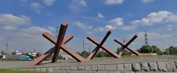 The Czech hedgehog was widely used during World War II by the Soviet Union in anti-tank defense. They were produced from any sturdy piece of metal and sometimes even wood, including railroad ties. Czech hedgehogs were especially effective in urban combat, where a single hedgehog could block an entire street. Czech hedgehogs thus became a symbol of "defense at all costs" in the Soviet Union; hence, the memorial to Moscow defenders, built alongside the M-10 highway in 1966, is composed of three giant Czech hedgehogs.