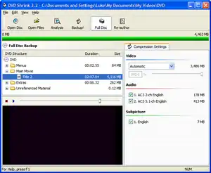DVD Shrink is a freeware[1] DVD transcoder program for Microsoft Windows that uses a DVD ripper to back up DVD video. The final versions are 3.2.0.15 (English) and 3.2.0.16 (German); all other versions, such as DVD Shrink 2010, are scams.[2] DVD Shrink's purpose is, as its name implies, to reduce the amount of data stored on a DVD with minimal loss of quality, although some loss of quality is inevitable (due to the lossy MPEG-2 compression algorithm). It creates a copy of a DVD, during which the coding only allowing the DVD to be played in certain geographical areas is removed, and copy protection may also be circumvented. A stamped DVD may require more space than is available on a writeable DVD, unless shrunk. Many commercially released video DVDs are dual layer (8.5 GB); DVD Shrink can make a shrunk copy which will fit on a single-layer (4.7 GB) writeable DVD, processing the video with some loss of quality and allowing the user to discard unwanted content such as foreign-language soundtracks.