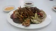 Daa laang originated from Chaozhou. Therefore, it is also called Chaozhou daa laang, which refers to the popular cold cuts and hot dishes from the food stalls in Chaozhou. Marinated food, seafood, pickled products and cooked dishes are the four main types of daa laang. It was then spread into Hong Kong by immigrants from Chaozhou in the 1950s. The traditional way to order the food is to choose the dish of choice in front of a waiter who would then, mark them down for customers. Your daa laang would then be made and sent to your table. Daa laang food would then be made and sent to their table. Because of daa laang's convenience and unique taste, the traditional dish is fast expanding into other parts of the country including Shenzhen.[1]
