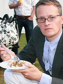 Samson lives and works in Rotterdam. Together with Dutch artists Tinkebell and Jonas Staal he is regarded as an exponent of a new category media artists.[1] By taking up distinct positions in the media, social issues are being broached. In Samson’s case, the artist distributes works that call for the rejection of the concept of sinfulness. According to some critics he takes a cynical stance, bearing resemblance to a right‑wing liberal argument.[2] Samson calls himself a ‘prosperity artist’ and argues for a re-evaluation of material objects.[3] Within this context, he repeatedly refers to the duality of the vanitas theme in classic painting.[4] Our lives would only be a temporary thing, and also full of spiritual and physical hardship. Basing himself on the Calvinist motto of ‘memento mori’ he propagates the idea that well-made products can help alleviate our earthly lives. In Samson’s view, even intellectuals should not hesitate to enjoy worldly pleasures.[5] This approach is expressed in performances, installations and photographs. He often seeks the collaboration of producers of luxury items and by making these sponsorships part of his art works he is challenging the boundaries of his artistic autonomy. Sponsors with whom Samson has realised art works include Bugaboo International, Smeg, Ketel One Vodka and Magimix.
