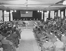 The Dachau camp trial (German: Dachau-Hauptprozess) was the first of the Dachau trials, a series of trials against war criminals held by the United States Army on the premises of the Dachau concentration camp. The main trial took place from 15 November to 13 December 1945. Forty people were charged with war crimes in connection with the Dachau concentration camp and its subcamps. The trial ended with 40 convictions, including 36 death sentences, of which 28 were carried out. The official name of the case was United States of America vs. Martin Gottfried Weiss et al. - Case 000-50-2.[1] The main trial served as a "parent case" for 123 subsequent cases. In the subsequent trials, all crimes that were established in the main trial were taken as proven, significantly shortening their duration relative to the parent case. The Dachau trials consisted of 6 total parent trials, each with their own subcases, and were held between 1945 and 1948. In total, there were 489 Dachau trials,[2] of which 394 were held within the confines of the camp itself.[3]